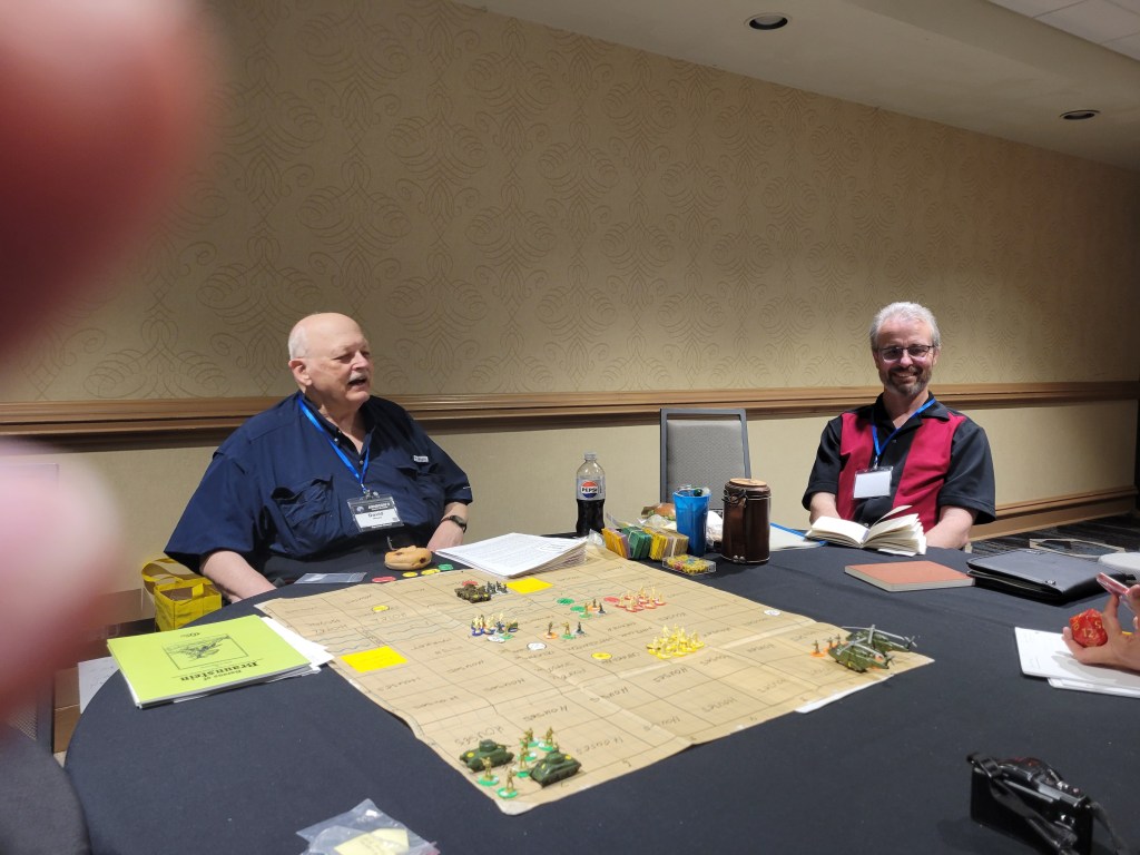 Starting Set-up at Braunstein #4. at Arnecon 2024. Also pictured: Maj. David Wesley, the talented @DragontimeDM (Minister of Information) and the famous Brown Stein. (Please excuse my fat chunky fingers in the picture!)